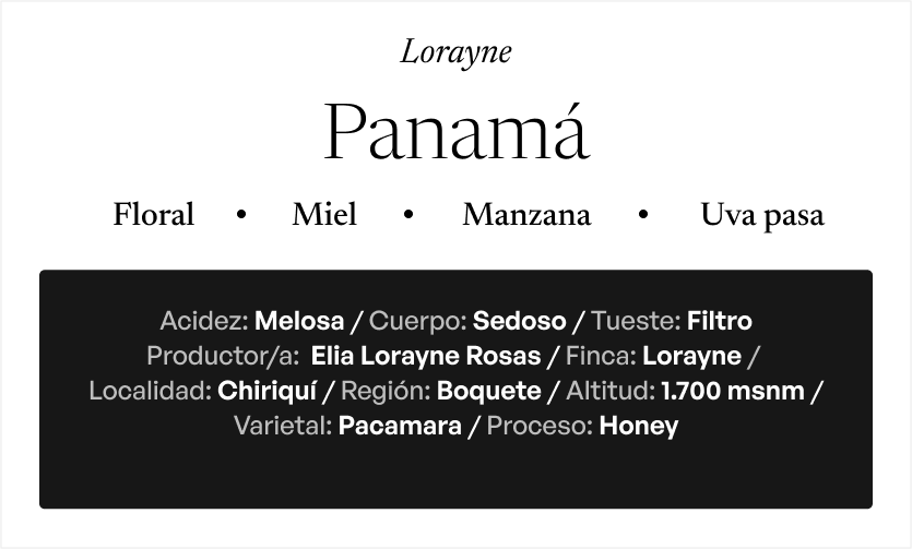 En las montañas de Boquete, Chiriquí (1.700 msnm), se encuentra la finca Lorayne, un proyecto familiar liderado por Elia Lorayne Rosas, caficultora que ha continuado el legado de su abuelo y padre. Su gestión es un referente de liderazgo femenino en Panamá, combinando tradición, innovación y compromiso con la equidad de género en la caficultura. Además, trabaja de forma cercana con la mano de obra indígena Ngäbe Buglé, fomentando el desarrollo social y la sostenibilidad.